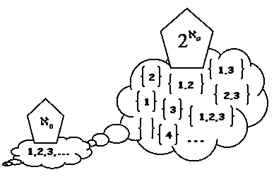 8 subsets. If a set is of cardinality n, then, according to what was said above, its power set is of cardinality 2n. As we see, power sets are much more "powerful" than their original sets; they are of much higher cardinality. This will be significant for our subsequent considerations. So much for general set theory. Now we turn to Cantor's infinite sets and their aleph numbers. Cantor indicated the cardinality of the set of ►natural numbers by means of the symbol א0 (pronounced as: aleph zero). This is the most important cardinal number, because it automatically belongs to all ►countably infinite sets insofar as any such set contains exactly the same number of elements as does the set of natural numbers. In some mathematical expositions, the number of natural numbers is indicated by naleph ("naive aleph", for the most basic kind of infinity). Cantor suspected that sets with even "higher" levels of infinity would also be of higher cardinality. He consequently named the next higher possible cardinality א1 (aleph one). Depending on how many levels of infinity exist, there will be corresponding additional aleph numbers א2, א3, א4 etc., each of which is greater than its predecessor and corresponds to the next higher level of infinity. Let us think about which concrete sets these cardinals — which at this point are still merely hypothetical — might belong to. The aleph numbers are subject to some strange rules of computing as a result of their infinity levels. Thus, for example, for each infinite cardinal we have the following rule א: In words: If an element is added to an infinite set then the number of elements in that set does not change. Infinite plus one equals infinite. The same applies if we add two, three, or even infinitely many elements: You'll find the reason for this rule if you look once again into the article on ►countability: If, for example, we add the set of even numbers to the set of odd numbers, thereby adding the numbers of their elements and hence their cardinalities, then we obtain the total set of natural numbers. However, since all three sets are countable, they all have the same cardinality; that is, each of the first two sets (the ones we added together) has exactly as many elements as the third (the one we got as a result). Hence, nothing changes with regard to the number of elements of an infinite set when we multiply it by 2, 3, 4 or any other finite number a: Let us now boldly multiply the number of elements in our infinite set by an infinite number. To do so we simply replace each individual element within the set by the complete set itself. As we can figure, this amounts to multiplying the set's cardinal by itelf. Yet this, too, leaves the number of elements unchanged: This formula basically represents the ►countability of fractions. For each natural number n corresponds to just as many fractions as there are natural numbers: n/1, n/2, n/3,. etc. Therefore, multiplication of a cardinal by itself corresponds to the transition from the set of natural numbers to the set of fractions. An infinite set retains the same number of elements even if it is multiplied by itself an indefinite number of times: Of course, the question now arises whether any given arithmetic operation on א will yield א The answer is: No, not every one. For Cantor has shown: 2א is even larger than א! Let us recall: 2א is the cardinality of the power set of a set with cardinality א. And the cardinality of a power set is always greater than that of the original set — and, as Cantor has shown, this applies even to infinite sets. Thus, the cardinality of the power set of an infinite set is indeed even "more infinite" than that of the original set. With this Cantor showed that there really is a sequence of aleph numbers א0, א1, א2, etc. For, since we can always derive a power set for any given infinite set, and even a power set for the power set, there is no upper limit regarding the aleph numbers. The sequence of alephs, and thereby that of the different levels of infinity, is itself infinite!