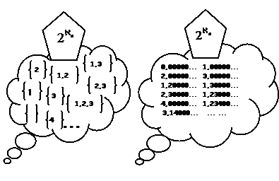 Besides the set of natural numbers with its cardinality א0 there is also the set of ►real numbers. These are all numbers with any given positions after the decimal point. We know that this set is not ►countable and hence that it is "more infinite" than the set of natural numbers. And now our sixty-four-thousand dollar question: What is the cardinality of the set of real numbers? Cantor has shown that this cardinal amounts to 2א0, which is equal to the cardinality of the natural numbers' power set. This can be illustrated as follows: The power set of the set of natural numbers contains all conceivable subsets, each of which contains no more than a countably infinite number of elements. The set of real numbers contains all conceivable numbers, each of which has no more than countably infinite positions after the decimal point. Thus both sets are comparable with regard to the number of their elements. Thus, we have now discovered two infinite cardinals belonging to concrete sets, namely א0, which is the cardinality of the set of natural numbers (and the smallest aleph number), and 2א0, which is the cardinality of the set of real numbers. To conclude this excursion on cardinals, let us think about the obvious question whether 20א may be the second smallest infinite cardinal or, in other words, whether the following applies: Or is there yet another infinite set whose cardinality is larger than א0, but at the same time smaller than 2א0? This seemingly innocuous question had dramatic consequences for Georg Cantor himself as well as for 20th century mathematics. The answer is quite surprising. You will find it in the article on the ►continuum hypothesis.