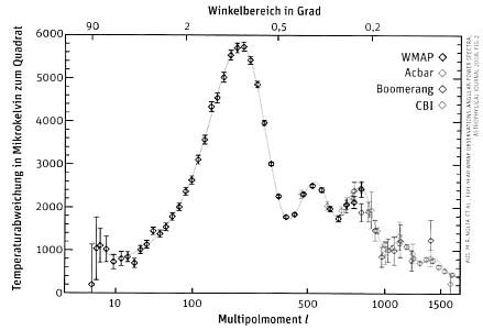 ►Astronomy is the scientific discipline that explores and describes the universe. What is beyond the universe — indeed, whether there is anything "beyond" it — cannot be decided by empirical observation alone. We can, however, empirically investigate how the universe has developed and how it will develop in the future. We obtain relevant information by observing the heavenly bodies and the cosmic ►background radiation, microwave radiation caused by the ►big bang that evenly fills the entire universe. Our observations indicate the following: ►The universe expands at an ever-increasing speed. The redshift of starlight can only be explained by the hypothesis that the distance between all galaxies constantly increases. This does not occur due to the galaxies' drifting apart since the time of the big bang, as we initially believed. Its explanation is, rather, the so-called ►dark energy — an item in the ►distance formula whose physical nature still has not been clarified — that spreads the spatial structure itself apart, and does at increasing speed. ►The universe is 13.7 billion years old. We obtain this numerical value by at least three different measurement methods. If we calculate back in time from the current redshift of distant galaxies, we reach a point in time at which the universe's density must have been at its highest point. Shortly after that, the first heavy elements must have evolved, elements whose ratio of isotopes has since undergone changes due to radioactive decay and which can also assist us in determining the age of the universe. The current temperature of the background radiation also fits into this picture: The ►big bang, the birth of the universe, took place approximately 13.7 billion years ago.* ►The universe is homogeneous and isotropic. This is a sophisticated way of saying that all places and directions look more or less the same. The Earth does not have any special status. At least, this is indicated by all observations of the distribution of matter in the universe. Doubling the distance resolution of a telescope lets you see eight times more galaxies — just what would be expected if the galaxies are evenly distributed in space. Even the cosmic ►background radiation is extremely uniform. This uniformity can only be explained by an extremely fast expansion of space — the so-called inflation — that must have occurred shortly after the ►big bang. ►The universe largely consists of unknown and invisible matter. Normal matter in solar systems, cosmic dust, and interstellar gas together contribute only 4% to the mass of the universe. More than a quarter of the universe consists of a still-mysterious ►dark matter. This dark matter is noticeable only because of its gravity; it was discovered by measuring the rotational speeds of stars in rotating galaxies. Stars rotate much faster around their galactic centers than would be possible on the basis of the galaxies' normal matter alone.