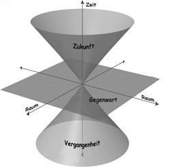 ►Special relativity theory limits the speed of objects to the speed of light. In the above diagram the cones (see also ►event horizon) correspond to the possible orbits of objects moving at the speed of light, that is, of light particles. Material objects can move only on orbits lying within these cones. An orbit that transgresses the limits of a cone means a surpassing of the speed of light. Again, an orbit that looks like a closed loop represents a ►journey through time into our past and back to our present location. Such time travel strikes us as impossible because it creates paradoxes such as the grandfather paradox (someone travels into the past and murders his own grandfather when the latter is still an infant). One reason for this paradox is that the laws of nature allow for complex interactions in our world such as the interactions between the molecules of a gas. This imposes on ►entropy a direction in time. In the 1940s the mathematician Kurt Gödel developed the model of an infinitely large, rotating world evenly filled with matter as a consistent solution to the field equations of general relativity theory. In this world the cones in the above diagram would be so distorted that objects could indeed move along closed loops in space-time. Time travel would thus be possible. However, such time travel would always involve a change of location, making it impossible to go back and kill one's grandfather. In our own world, time travel would be theoretically conceivable in the form of journeys to ►parallel worlds or in the vicinity of ►singularities. For example, along an orbit around a ►black hole that rotates sufficiently fast, time might move backwards. But such fast-rotating black holes probably do not exist in the universe. In 1974, the notoriously theatrical physicist Frank Tipler proposed the construction of a time machine made of a cylinder-shaped arrangement of neutron stars orbiting one another at a high speed. A spiral-shaped orbit through the center of the cylinder would carry objects back in time. As it is not so easy to construct an object out of neutron stars, however, many physicists do not believe that a time machine could be created in this manner. To measure time, we use objects that change along the axis of time in a specified way: clocks. Clocks can be human-made, such as the ►ten-thousand-year clock. But in physics we frequently also use natural effects such as the decay of ►atoms or the oscillation frequency of light waves to measure very short time periods. Psychology teaches that measured and perceived time often clearly differ. An eventful period is perceived as short, while uneventful periods seem to us long or even ►eternal. Paradoxically, in our memory the respective time periods will appear to us in precisely the opposite way. Perceived time is not infinitely divisible. Whether two events are perceived as separate depends on the sense organ: Optical impressions must be 20 to 30 milliseconds apart in order to be perceived as separate events. Acoustic signals require only three milliseconds, and tactile stimuli require up to 40 milliseconds. Present perceptions extend over a period of approximately three seconds. Furthermore, almost all living creatures (including some monads) possess some kind of biological inner clock, which usually adjusts to the day-night rhythm. Shifting this rhythm, for example due to a plane trip, may confuse this inner clock, leading to jet lag. If there no external signs of time whatsoever, as when people stay in bunkers or submarines, after a while a sleeping-waking rhythm of around 25 hours sets in. At present we do not understand why this natural rhythm of ours is slightly longer than the terrestrial day. Links Related to the Topic