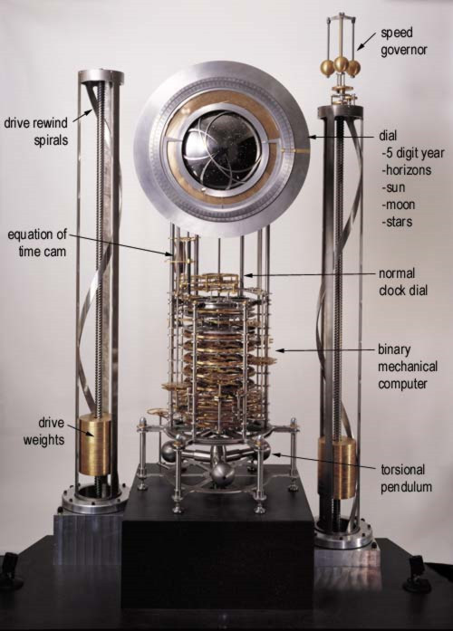 To run for at least 10,000 years without human intervention, the clockwork has to be built of extremely durable materials. As far as possible it should not contain any gear wheels, for they would tend to wear down over the millennia. At the same time, the clock should be of low material value so that future generations will not be tempted to ransack it even in during drastic economic or social crises. The source of energy should be renewable, but should not be something that can be stolen. The clock should be very precise, but not require electronic equipment, since it should be possible to repair it with the most basic tools. For the same reason, the clock should not contain any hidden or encapsuled parts, so that its mode of operation can be easily discerned. Moreover, it should be scalable, meaning that we can construct it in virtually any size using the same structural design. These are challenging requirements. Nevertheless, the Long Now Foundation has succeeded in building such a clock. The scaled-down prototype depicted above was started at the turn of the millenium. It mechanically synchronizes itself every day according to the position of the sun and is currently at the Science Museum in London. The final clock will be built at a much larger scale on top of an isolated mountain in the Nevada desert. Links Related to the topic